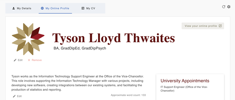 - You can click the View your online profile button on the top-left of the page to see your live profile.